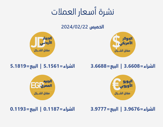 جاءت أسعار صرف العملات مقابل الشيقل الإسرائيلي، اليوم الخميس، بحسب سلطة النقد الفلسطينية، على النحو التالي: