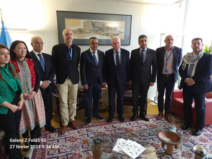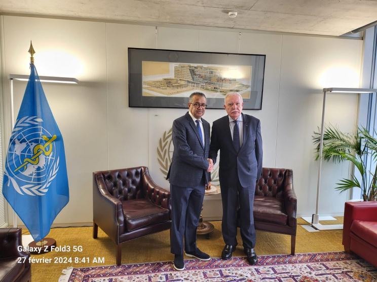 التقى د. رياض المالكي وزير الخارجية والمغتربين صباح اليوم الثلاثاء، 27 شباط فبراير 2024، في مقر منظمة الصحة العالمية في جنيف، المدير العام لمنظمة الصحة العالمية الدكتور تيدروس، وذلك بحضور مدير مكتب منظمة الصحة العالمية في القدس الدكتور ريك بيبركورن والسفير إبراهيم خريشي المندوب المراقب الدائم لدولة فلسطين لدى مكتب الأمم المتحدة في جنيف والسفير الدكتور عمر عوض الله مساعد الوزير للامم المتحدة والمنظمات الدولية والمستشار رياض عواجة من بعثة فلسطين في جنيف.