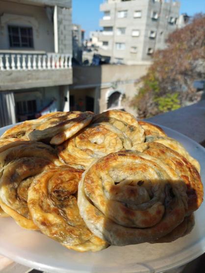 صاحبة الـ (26 عامًا)، ولاء جابر، من شمال قطاع غزة، غضت بصرها عن المأساة قليلًا وبدأت مشرعها البسيط الذي تعرض فيه فطائر السبانخ الشهيّة للبيع، تصنعها يدويًا في منزل النزوح الذي يأويها هي وعائلتها في مدينة رفح جنوب القطاع.