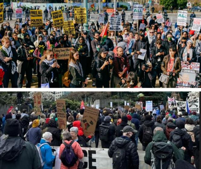 وفي سياتل بولاية واشنطن، اعتصم الآلاف أمام قمة "شركة بوينغ لموردي الدفاع والطيران"، للمطالبة بإنهاء التواطؤ في الإبادة الجماعية الإسرائيلية، عبر تزويد دولة الاحتلال بالطائرات المقاتلة والأسلحة التي تقصف المدنيين، وتدمر ممتلكاتهم.