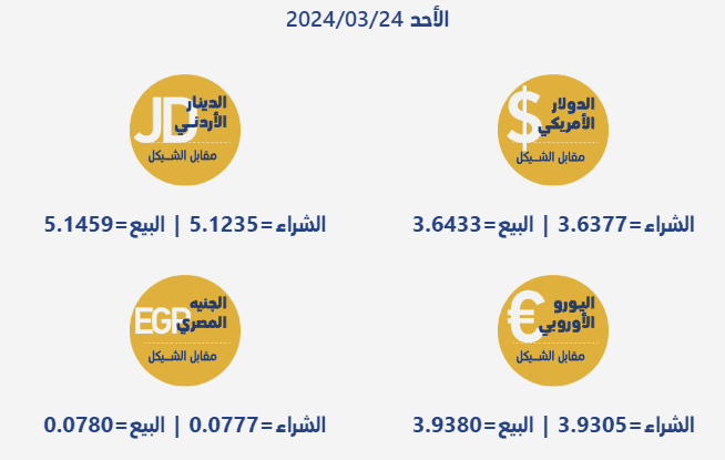 جاءت أسعار صرف العملات مقابل الشيقل الإسرائيلي، اليوم الأحد، بحسب سلطة النقد الفلسطينية، على النحو التالي: