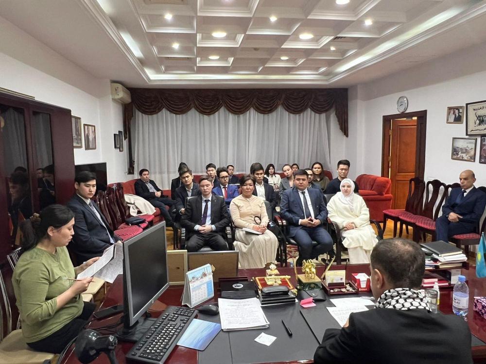 وقال أبو زيد أمام نخبة طلاب العلاقات الدولية والقانون الدولي في كازاخستان، يصادف اليوم مرور أكثر من 200 يوماً على العدوان الإسرائيلي على قطاع غزة وكافة الأراضي الفلسطينية المحتلة بما فيها القدس الشرقية ، حيث بلغ عدد الشهداء أكثر من 34 ألف فلسطيني بالإضافة إلى ما يقارب الـ 10 ألآف فلسطيني مفقود تحت الأنقاض وعشرات الألآف من المصابين الفلسطينيين وأن 70 % من الضحايا هم نساء وأطفال ، هذا بالإضافة إلى المئات من الشهداء في محافظات الضفة الغربية ومدينة القدس ، كما قام الإحتلال الإسرائيلي ومنذ أن بدأ عدوانه الغاشم على الشعب الفلسطيني بتدمير عشرات الألآف من المباني السكنية ومئات المؤسسات الحكومية والتعليمية والصحية وتهجير مايقارب من 1.7 مليون فلسطيني من منازلهم وشنه حرب إبادة ضد الشعب الفلسطيني في قطاع غزة غير مكترس لكافة القوانين الدولية والإنسانية.