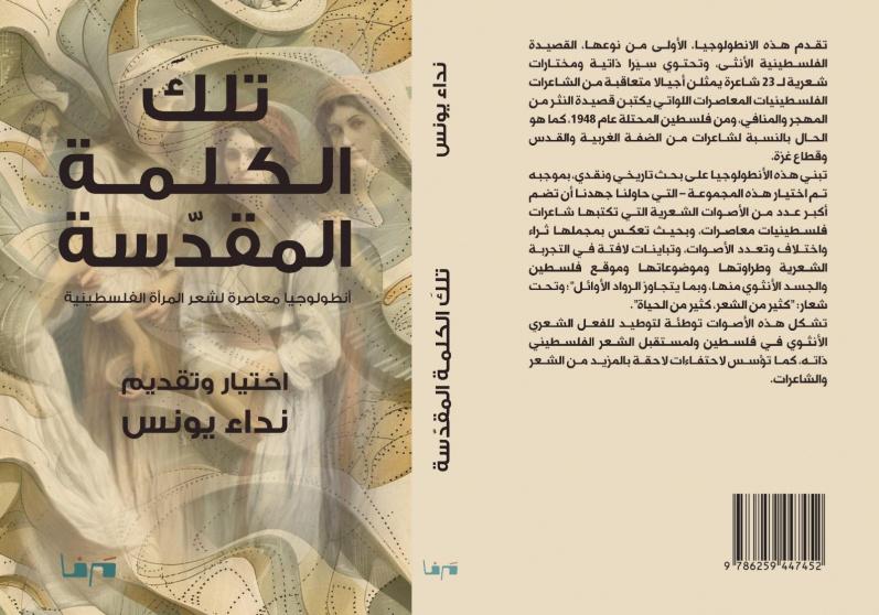 عن منشورات مرفأ في بيروت، صدرت أول انطولوجيا معاصرة لشعر المرأة الفلسطينية، اختارتها وقدمت لها الشاعرة والإعلامية والمترجمة الفلسطينية د. نداء يونس بعنوان "تلك الكلمة المقدسة". تقع المجموعة في 300 صفحة من القطع المتوسط، وتحتوي سيرا ذاتية ومختارات شعرية لـ 23 شاعرة يمثلن أجيالا متعاقبة من الشاعرات الفلسطينيات المعاصرات اللواتي يكتبن قصيدة النثر من المهجر والمنافي، ومن فلسطين المحتلة عام 1948، كما هو الحال بالنسبة لشاعرات من الضفة الغربية والقدس وقطاع غزة.
