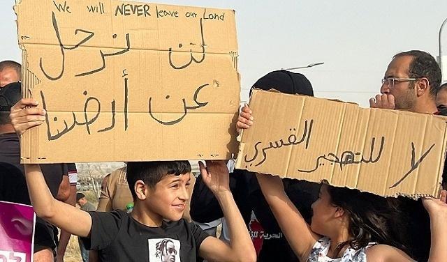 وكتب على بعض اللافتات:" لا للهدم والتشريد"، و"عرب النقب أحق بالأرض"، و"من قبل قيام ‘الدولة‘ نحن هنا"، و"لن نخرج من أرضنا".