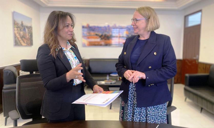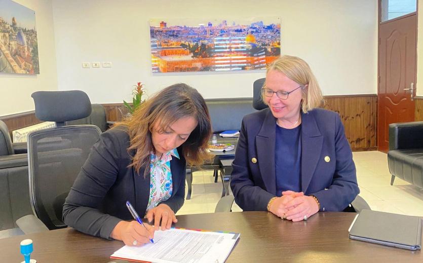 وقعت وزيرة التنمية الاجتماعية د. سماح أبو عون حمد في مكتبها اليوم مع الممثلة الخاصة لهيئة الأمم المتحدة للمرأة في فلسطين ماريس جيموند، مصادقة على موازنة مشروع حياة لدعم النساء في فلسطين، وبحثت معها واقع النساء في فلسطين، خاصة في ظل العدوان الإسرائيلي المستمر، وأثره على واقع النساء، وضرورة توفير الحاجات الأساسية للنساء وخاصة الصحية منها.