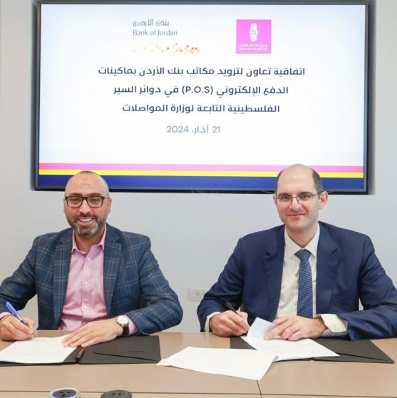 وقع بنك فلسطين وبنك الأردن، اتفاقية تعاون مشتركة لتزويد مكاتب بنـــك الأردن المتواجدة في دوائر السير بماكينات الدفـــع الإلكتروني (P.O.S) بالتعاون مع وزارة المواصلات بهدف التسهيل على المواطنين دفع الرسوم المخصصة للوزارة ودوائر السير عبر البطاقات البنكية وأنظمة الدفع الإلكترونية الحديثة.