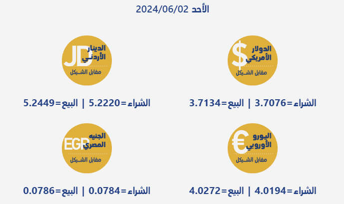 جاءت أسعار صرف العملات مقابل الشيقل الإسرائيلي، اليوم الأحد، بحسب سلطة النقد الفلسطينية، على النحو التالي: