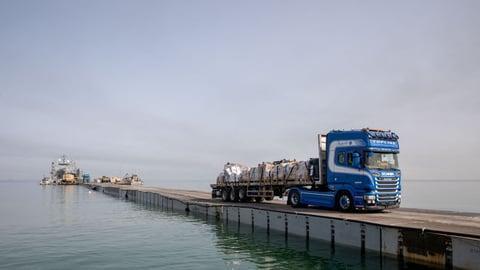 وقال المسؤولان، اللذان تحدثا شريطة عدم الكشف عن هويتيهما، إن الرصيف أعيد ربطه بالشاطئ أمس الأربعاء بعد فصله مؤقتا يوم الجمعة الماضي بسبب سوء الأحوال في البحر.