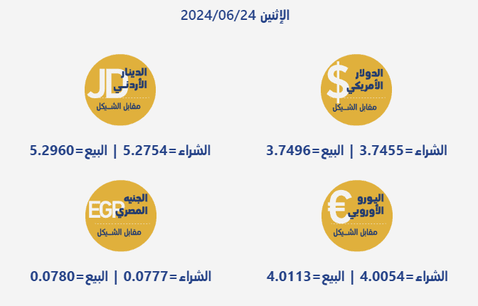 جاءت أسعار صرف العملات مقابل الشيقل الإسرائيلي، اليوم الإثنين، بحسب سلطة النقد الفلسطينية، على النحو التالي: