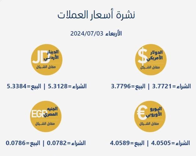 جاءت أسعار صرف العملات مقابل الشيقل الإسرائيلي، اليوم الأربعاء، بحسب سلطة النقد الفلسطينية، على النحو التالي: