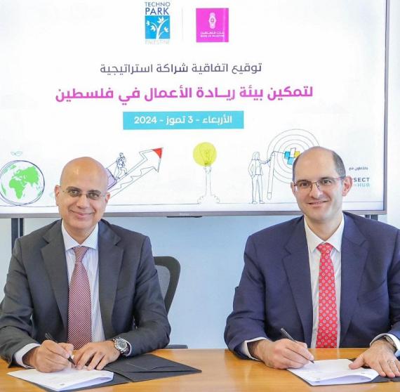 وقع بنك فلسطين والحديقة التكنولوجية الفلسطينية الهندية "تكنوبارك"، اتفاقية لدعم بيئة الابتكار وريادة الأعمال في فلسطين، مع التركيز بشكل خاص على النساء والشباب لتعزيز القطاع التكنولوجي، وخلق نظام بيئي مستدام ومزدهر للأعمال المبتكرة في فلسطين، بما فيها تسخير الموارد والإمكانيات لإتاحة الفرص أمام المبتكرين والشركات الناشئة في الوطن والمهجر، وذلك عبر مجموعة من الأنشطة والفعاليات التدريبية، والتفكير الإبداعي، وإخراج الأفكار الخلاقة، وتعزيز التواصل مع الشباب الفلسطيني المغترب عبر ورشات العمل، والبرامج الحوارية والاعلامية، إضافة الى تطوير أساليب استخدام التكنولوجيا والبرمجة لمساعدة ريادي الأعمال في تلبية احتياجاتهم وتعاملاتهم المالية.