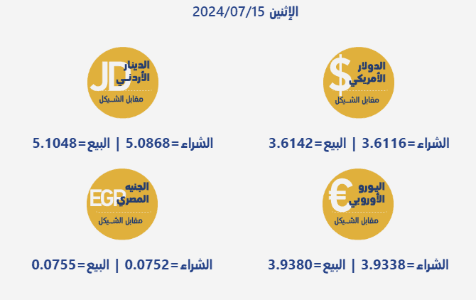 جاءت أسعار صرف العملات مقابل الشيقل الإسرائيلي، اليوم الإثنين، بحسب سلطة النقد الفلسطينية، على النحو التالي:
