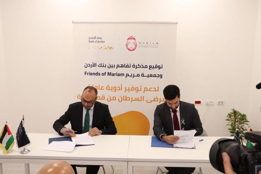 وقع بنك الأردن في فلسطين مذكرة تفاهم مع مؤسسة مريم لمكافحة السرطان، بهدف توفير أدوية عاجلة لمرضى السرطان من قطاع غزة. وجرى توقيع المذكرة في مقر مؤسسة مريم في رام الله، بحضور الرئيس التنفيذي لفروع بنك الأردن في فلسطين، السيد " سيف عيسى"، وممثلي مؤسسة مريم في فلسطين؛ من مجلس الادارة الدكتور " وليد نمور" والرئيس التنفيذي للمؤسسة السيد "محمد حامد"، وعدد من موظفي الإدارة من الطرفين، بالإضافة الى سفراء المؤسسة وحضور شخصيات من المجتمع المحلي والإعلام.
