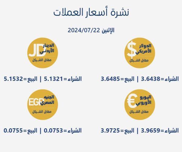 جاءت أسعار صرف العملات مقابل الشيقل الإسرائيلي، اليوم الإثنين، بحسب سلطة النقد الفلسطينية، على النحو التالي: