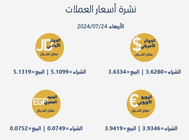 جاءت أسعار صرف العملات مقابل الشيقل الإسرائيلي، اليوم الأربعاء، بحسب سلطة النقد الفلسطينية، على النحو التالي: