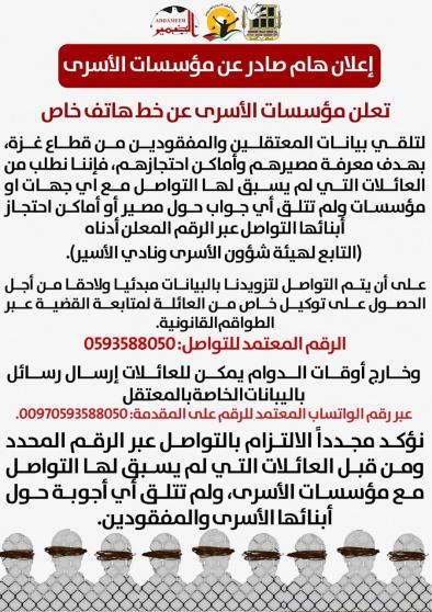 وطالبت مؤسسات الأسرى من العائلات التي لم يسبق لها التواصل مع اي جهات او مؤسسات ولم تتلق أي جواب حول مصير أو أماكن احتجاز أبنائها التواصل عبر الرقم المعلن أدناه (التابع لهيئة شؤون الأسرى ونادي الأسير الفلسطيني)