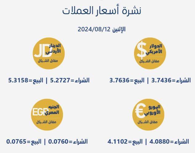 جاءت أسعار صرف العملات مقابل الشيقل، اليوم الإثنين، بحسب سلطة النقد الفلسطينية، على النحو التالي: