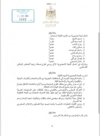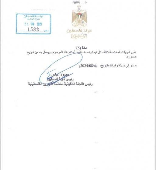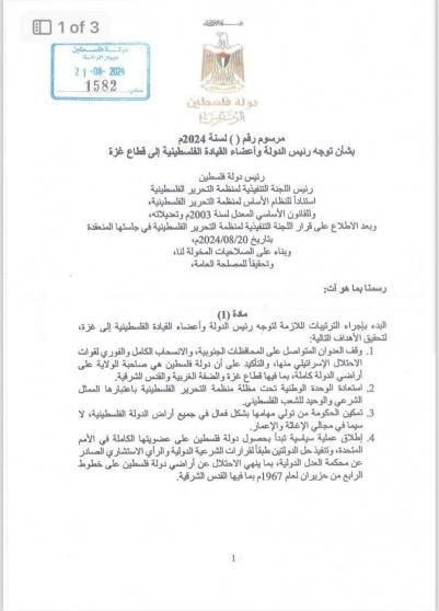 مرسوم بشأن توجه رئيس الدولة وأعضاء القيادة الفلسطينية إلى قطاع غزة