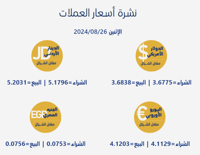 جاءت أسعار صرف العملات مقابل الشيقل الإسرائيلي، اليوم الإثنين، بحسب سلطة النقد الفلسطينية، على النحو التالي:
