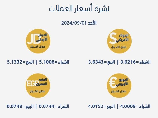 جاءت أسعار صرف العملات مقابل الشيقل، اليوم الأحد، بحسب سلطة النقد الفلسطينية، على النحو التالي: