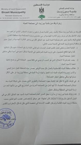كما طالب سلطة المياه الفلسطينية بالعمل بكل جدية لتوفير مصدر مياه للمنطقة كحلٍ استراتيجي والإسراع بزيادة كميات المياه لسد العجز وانهاء أزمة المياه في منطقة بيرزيت أو على الأقل مساواتها بباقي مناطق امتياز المصلحة .