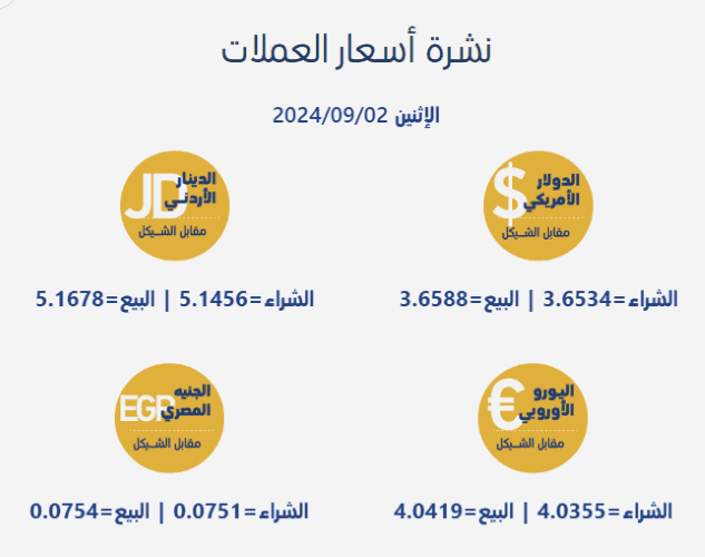 مقابل الشيقل، اليوم الإثنين، بحسب سلطة النقد الفلسطينية، على النحو التالي: