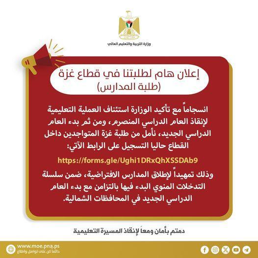وقالت الوزارة في إعلانها: "انسجاما مع تأكيد الوزارة استئناف العملية التعليمية لإنقاذ العام الدراسي المنصرم، ومن ثم بدء العام الدراسي الجديد، نأمل من طلبة غزة المتواجدين داخل القطاع حاليا التسجيل على الرابط الآتي: اضغط هنا