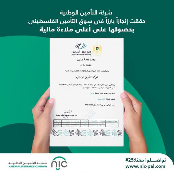 بناءً على تقرير هيئة سوق رأس المال الفلسطينية شركة التأمين الوطنية تتصدر تصنيف الملاءة المالية للعام 2023 وتحصل على المركز الأول بين شركات التأمين.