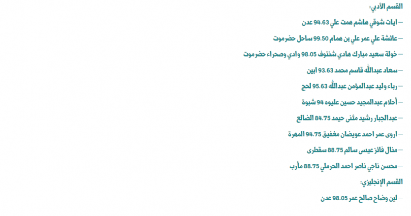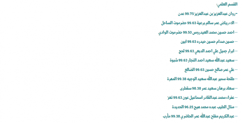 هذا وأعلن نائب اللجنة العليا للاختبارات وكيل قطاع المناهج والتوجيه الدكتور عبدالغني الشوذبي، أسماء أوائل الطلاب على مستوى المحافظات المحررة في اليمن للعام الدراسي ٢٠٢٤/٢٠٢٣م وهم على ما يلي: