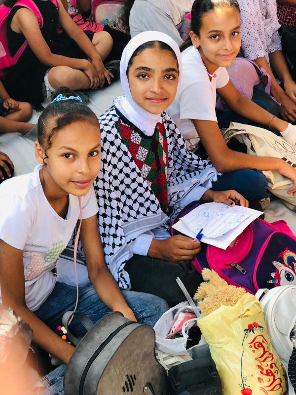 تقول الحج لـ "رايـــة": "مدرستي تدمرت وبيتنا أيضًا، الأستاذة إسراء جعلتنا نتعلم في خيمة بدلًا من الشارع، وهذا أمر يسعدني جدًا".