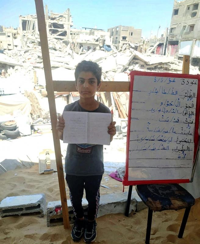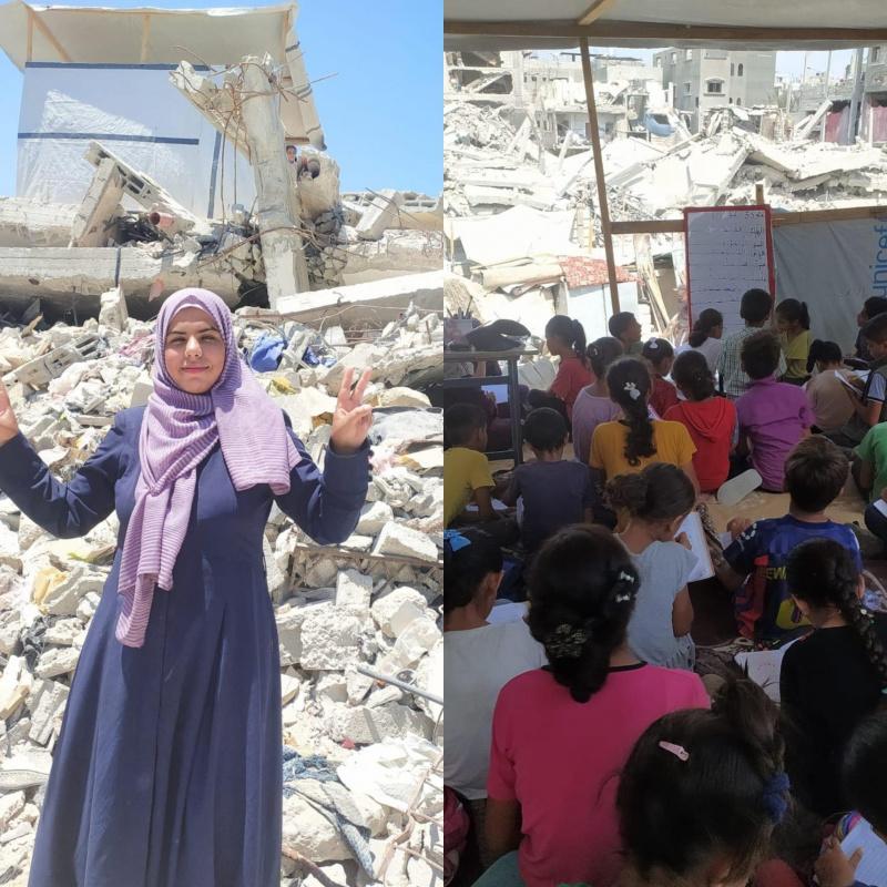 تواجه المعلّمة إسراء أبو مصطفى ويلات الحرب والدمار الذي حلّ بقطاع غزة بكافة قطاعاته وخاصة التعليمية، صامدة أمام الحرب، مثبتة أقدامها فوق الركام لتبني مكانًا تعليميًا يجابه الأمية التي يريدها الاحتلال لأطفال غزة.