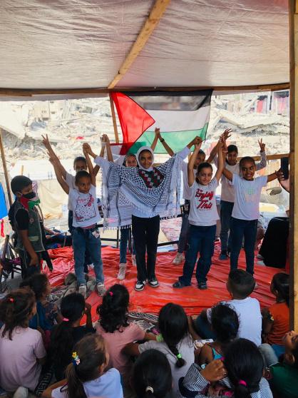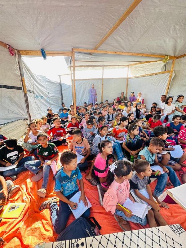 وفي دلالة على حق العيش والتعلم، تفتتح المعلمة إسراء خيمة تعليمية، تستهدف فيها وتركز على الأطفال اليتامى الذين فقدوا آبائهم وأمهاتهم خلال الحرب، مقدمة لهم التعليم والترفيه في محاولة للتخفيف عن الألم النفسي الذي مروا به.