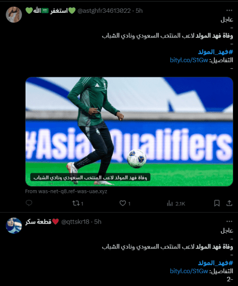 وكما يظهر في الصورة بالأسفل، فقد نشرت صفحات على تويتر نبأ وفاة فهد المولد لاعب منتخب السعودية "الأخضر" ونادي الشباب، بينما لم تنسب هذه إلى مصادر رسمية تؤكد حقيقة هذا النبأ من عدمه حتى الآن.
