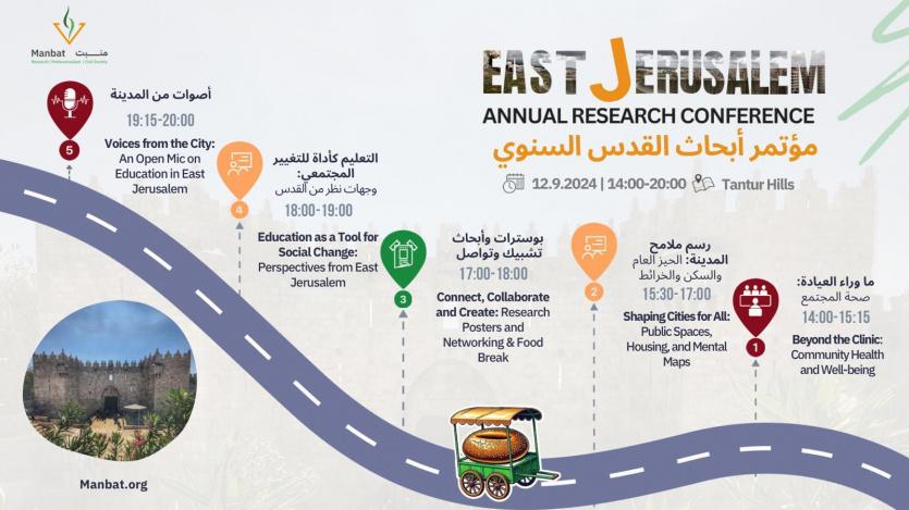 اختتمت مؤسسة منبت المقدسية، مؤتمر أبحاث القدس (EJ-ARC) في مدينة القدس، بمشاركة أكثر من 130 باحثا ومهنيا من مختلف القطاعات، وممثلين عن مؤسسات المجتمع المدني المحلية والدولية، وذلك لتعزيز البحث العلمي وتطوير حلول عملية لدعم المجتمع المقدسي.