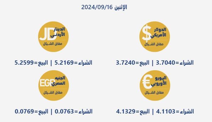 جاءت أسعار صرف العملات مقابل الشيقل، اليوم الإثنين، بحسب سلطة النقد الفلسطينية، على النحو التالي: