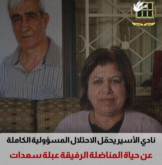 حمّل نادي الأسير الفلسطيني سلطات الاحتلال الإسرائيلي المسؤولية الكاملة عن حياة المعتقلة عبلة سعدات (67 عاماً) من رام الله، زوجة الأمين العام للجبهة الشعبية الأسير أحمد سعدات، التي اعتُقلت صباح اليوم الثلاثاء من منزلها في رام الله، ضمن حملة اعتقالات واسعة نفذها جيش الاحتلال في الضفة، وطالت 30 مواطنًا من بينهم امرأة أخرى، وطالبة في جامعة بيرزيت.