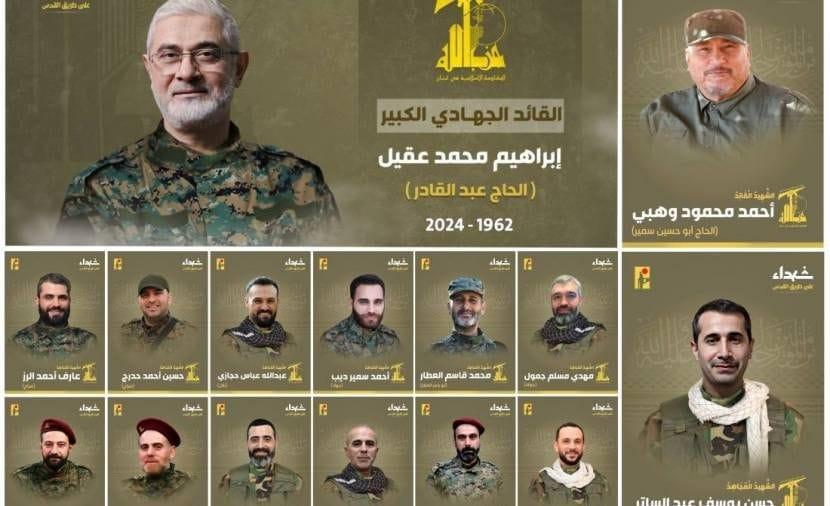 نعى حزب الله، حتى صباح اليوم السبت، 16 عنصرا له بينهم القيادي مسؤول العمليات في حزب الله، إبراهيم عقيل، وقيادي عسكري آخر، أحمد محمود وهبي والذي قاد العمليّات العسكريّة لقوّة الرضوان بداية في جبهة الإسناد في 8 تشرين الأول 2023، وحتى مطلع العام 2024، ليُعاود تصديه لمسؤوليّة وحدة التدريب المركزي بعد استشهاد الشهيد القائد وسام الطويل، وأصيب أكثر من 60 آخرين جراء عدوان إسرائيلي على الضاحية الجنوبية لبيروت؛ مساء الجمعة.