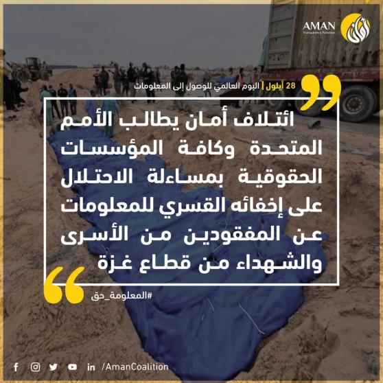 طالب الائتلاف من أجل النزاهة والمساءلة (أمان) الأمم المتحدة وكافة المؤسسات الحقوقية بتنفيذ حملة دولية لمساءلة ومحاسبة الاحتلال على ما يقوم به من جرائم ضد الإنسانية، والتي تشمل الإخفاء القسري للمعلومات عن الأشخاص المفقودين من أسرى وشهداء في قطاع غزة، وعدم الإفصاح عن أسمائهم وأعدادهم في السجون، مؤكداً بدوره على حق الأُسَر في الحصول على المعلومات عن أحبائها، وإجراء مراسم الدفن اللائقة بحق الشهداء منهم، بما يحفظ الكرامة الإنسانية والأعراف والتقاليد، خاصة في ظل حرب الإبادة المستمرة في القطاع، ووسط ما تؤكده تقارير المؤسسات الحقوقية من ارتكاب الاحتلال سلسلة من الجرائم، من بينها الإخفاء القسري، وجرائم تعذيب وقتل ممنهج في السجون الاسرائيلية بدم بارد، وبصمت مقصود.