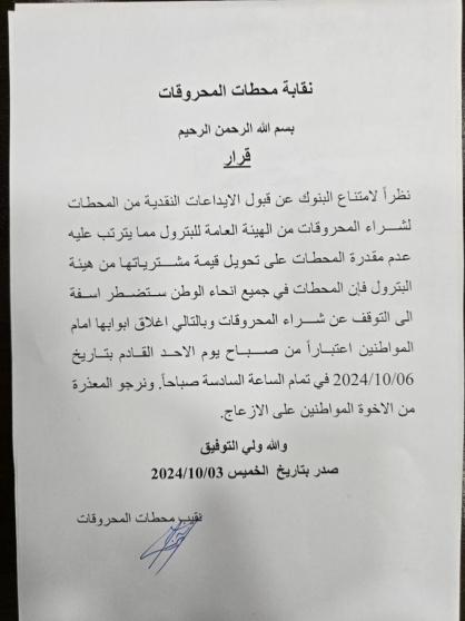 وبينت النقابة أن ذلك يأتي نظرا لامتناع البنوك عن قبول الايداعات النقدية لشراء المحروقات من الهيئة العامة للبترول، ما يترتب عليه عدم مقدرة المحطات على تحويل قيمة مشترياتها من هيئة البترول.