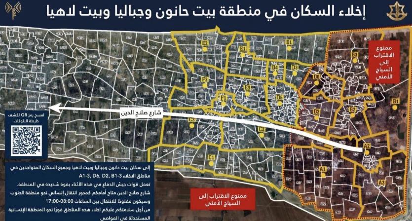 وطالب الجيش الإسرائيلي سكان بيت حانون وجباليا وبيت لاهيا وجميع السكان المتواجدين في مناطق الإخلاء A1-3, D6, D2, B1-3، بالإخلاء الفوري.
