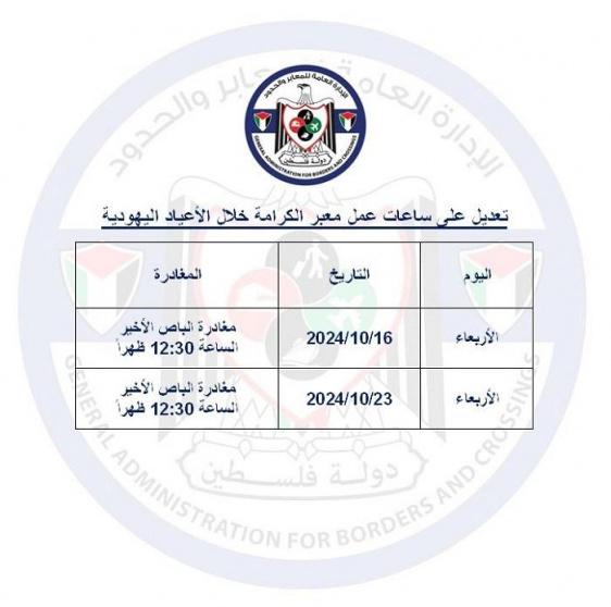 أعلنت الإدارة العامة للمعابر والحدود، عن إجراء تعديل على ساعات عمل معبر الكرامة يومي الأربعاء 16 و23 تشرين الأول الجاري، بسبب الأعياد اليهودية.