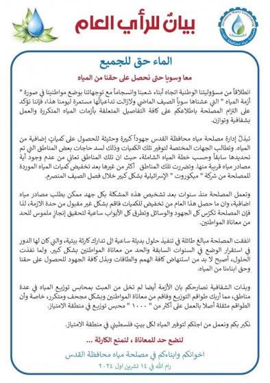 انطلاقاً من مسؤوليتنا الوطنية اتجاه أبناء شعبنا وانسجاماً مع توجهاتنا بوضع مواطنينا في صورة " أزمة المياه " التي عشناها سوياً الصيف الماضي ولازالت تداعياتُها مستمرة ليومنا هذا، فإننا نؤكد على التزام المصلحة باطلاعكم على كافة التفاصيل المتعلقة بأزمات المياه المتكررة والعمل بشفافية وتوازن.