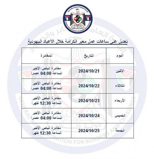 أعلنت الإدارة العامة للمعابر والحدود، اليوم الأحد، عن تغيير مواعيد العمل على معبر الكرامة خلال الأسبوع الحالي.