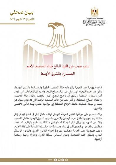 من جهتها، جددت جمهورية مصر العربية، اليوم السبت، موقفها الداعي لسرعة التوصل إلى وقف إطلاق النار في قطاع غزة ضمن صفقة يتم بموجبها إطلاق سراح الرهائن والأسرى.