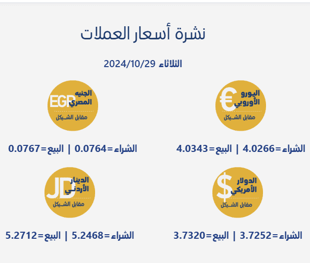 جاءت أسعار صرف العملات مقابل الشيقل الإسرائيلي، اليوم الثلاثاء، بحسب سلطة النقد الفلسطينية، على النحو التالي: