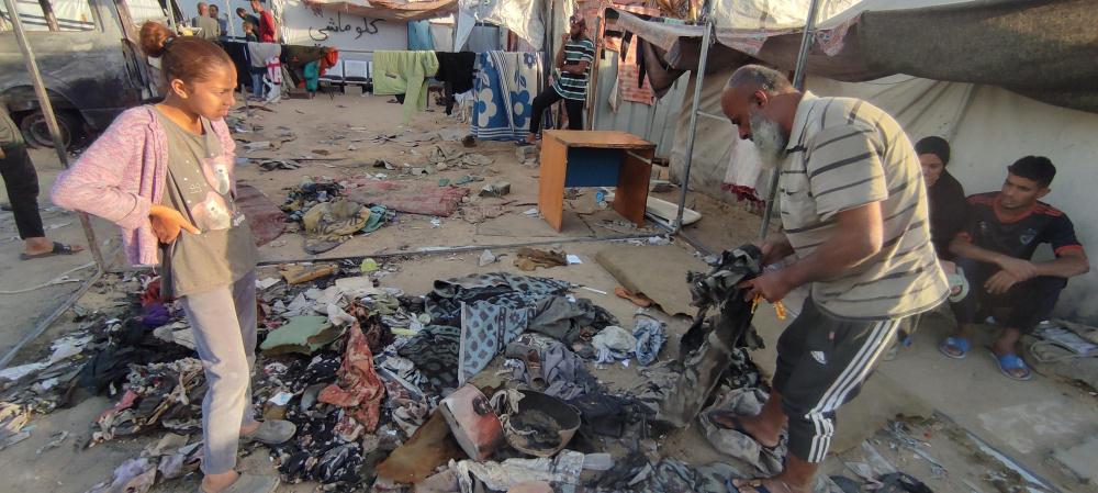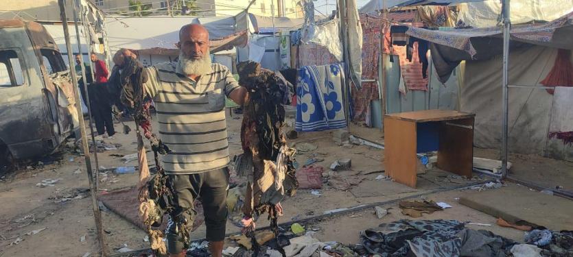 وكذلك زوجته الأربعينية، قالت: "الحرب كبرتني 20 سنة، فش عنا اشي، الخيمة كلها انحرقت، يا رب يوقف معنا أولاد الحلال والقلوب الرحيمة، يطلعوا لنا بعين الرحمة، نجيب عفش وخيمة وأواعي تسترنا أنا وبناتي السبعة وبنتي مرت الشهيد وبنتها.. الحمد لله على كل شيء، الحمد لله". ختمت أم محمد ثم تركتنا ذاهبة خلف زوجها نحو بقايا الخيمة المُحترقة علّهم يتعثرون بقطعة ناجية من الحريق.