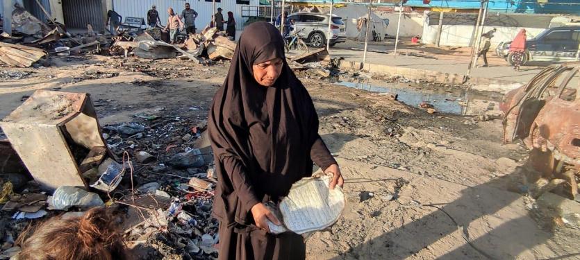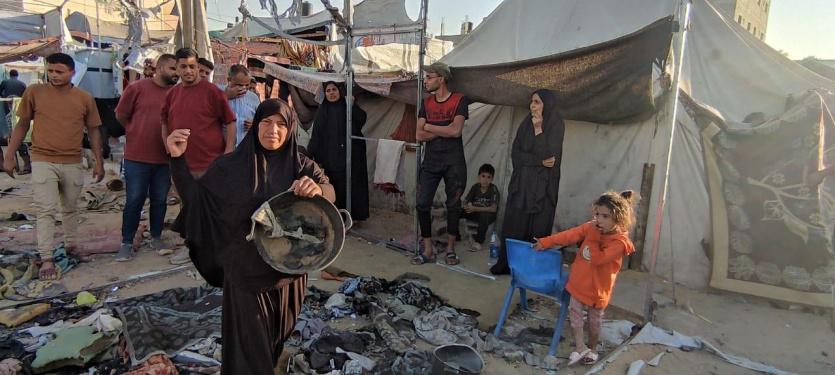 "رايــة" قابلت العم أبو محمد وزوجته، على أنقاض الخيمة المحروقة، حيث تجمع عدد من الجيران النازحين حولهما وهما يلتقطان بقايا العفش المُحترق، علها تشكل حجر الأساس لإعادة الحياة للمكان.