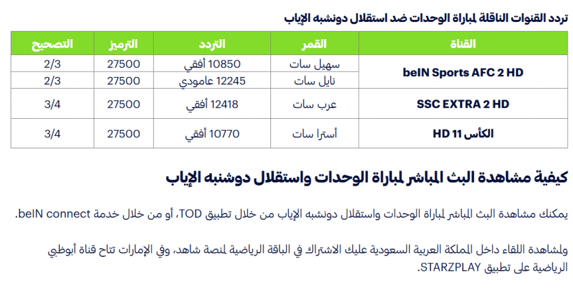 ونرفق لكم في سياق هذا التقرير، تردد قناة beIN Sports AFC 2 HD وأيضا تردد قناة SSC EXTRA 2 HD وكذلك تردد الكأس 11 HD على القمر الصناعي نايل سات وسهيل سات وعرب سات وأسترا سات، إذ نحرص على ذلك دوما.