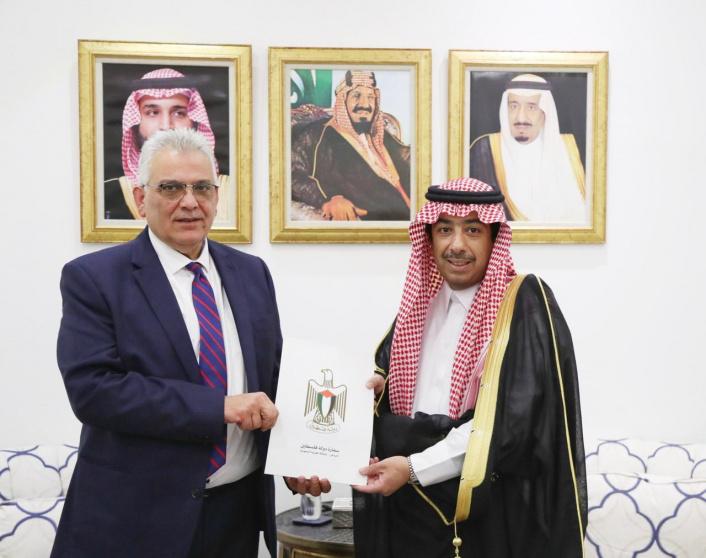 قدم السفير مازن غنيم، نسخة من أوراق اعتماده إلى وكيل وزارة الخارجية السعودية لشؤون المراسم عبد المجيد السماري، نيابةً عن وزير الخارجية الأمير فيصل بن فرحان، سفيرا مفوضاً فوق العادة لدولة فلسطين لدى المملكة العربية السعودية.