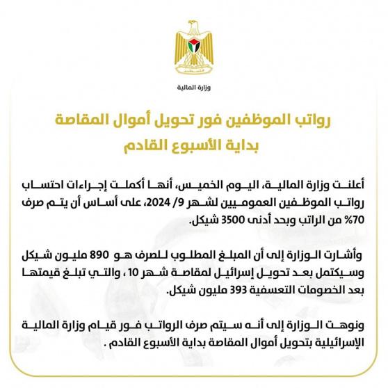 أعلنت وزارة المالية، مساء الخميس، أنها أكملت إجراءات احتساب رواتب الموظفين العموميين لشهر أيلول/سبتمبر 2024، على أساس أن يتم صرف 70% من الراتب وبحد أدنى 3500 شيقل.